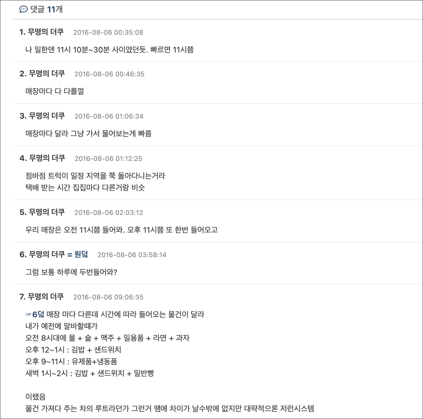 물건을 배송하는 차가 돌면서 배달할거기 때문에 매장마다 물건 들어오는 시간은 다를수 밖에 없을 것 같네요. 매장에 가서 물어보는게 제일 정확할것 같아요